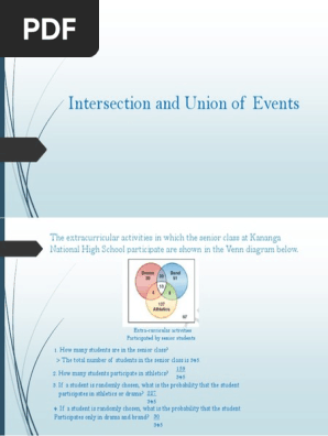 To understand more about the probability of union and intersection of events ask students to proceed to activity 3. Let a be the set of even numbers less than ten. Discuss the illustrative example or give similar examples to help them understand the concept of venn diagram. The total number of students in the senior class is 345.