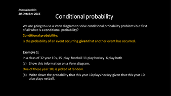 This is my powerpoint introducing conditional probability using a visual method and fractions. Conditional probability venn diagrams.