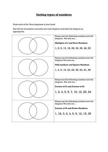 This is a rich venn diagram activity on types of number including factors multiples primes square numbers and more. Venn diagrams are used to picture the relationship between different groups or things to draw a venn diagram you start with a big rectangle called universe and then you draw to circles overlap each other or not. Compare and contrast 2 characters in a story 2 different settings or 2 events. Free printable venn diagram math worksheets can be used by anyone at your home for educating and learning objective.